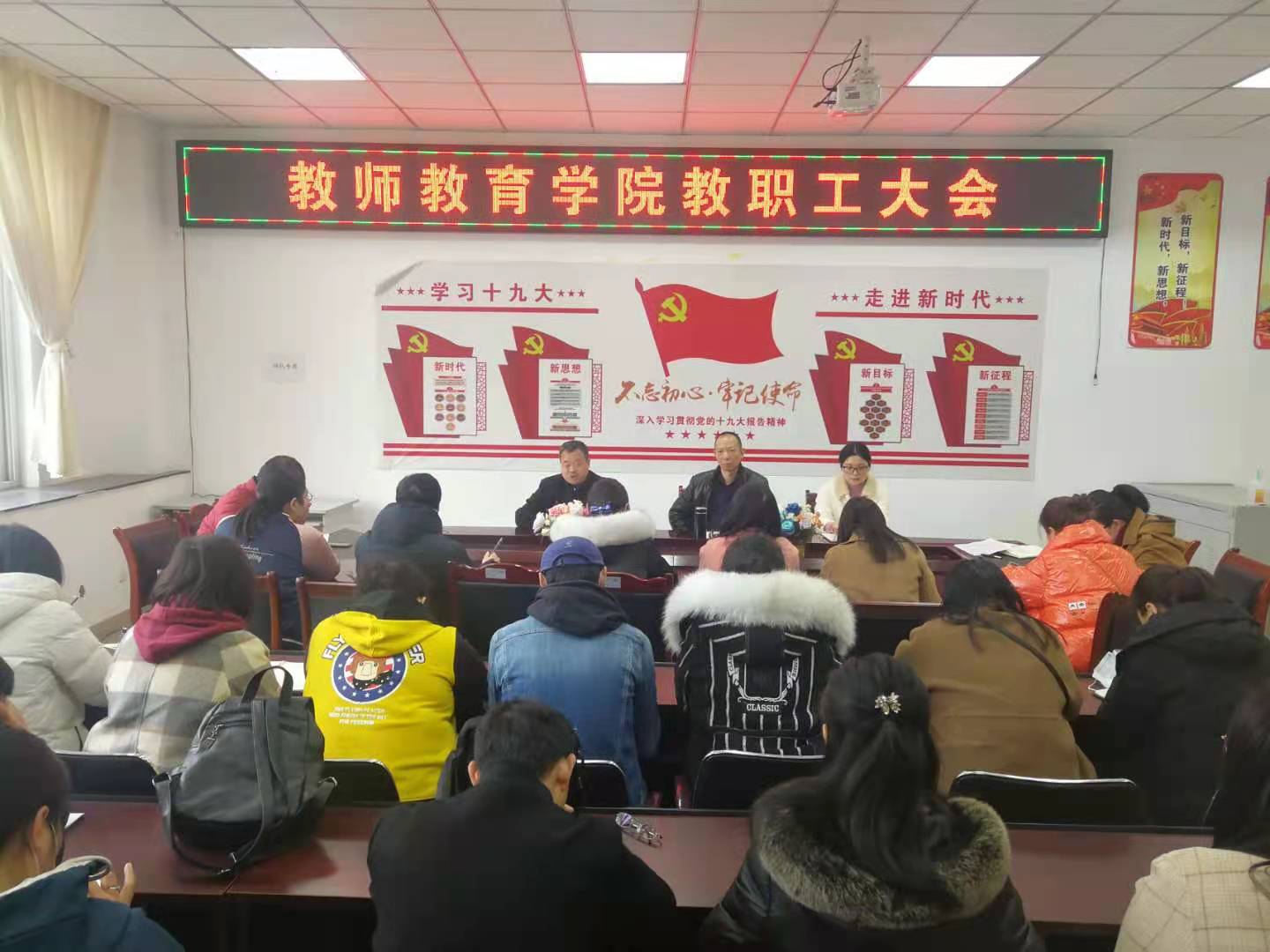 (教院讯)2月28日上午10点,教师教育学院教职工大会在B305会议室顺利召开。会议对上学期期末工作、假期工作进行了总结,对新学期开学工作进行了部署安排。