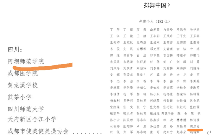我校从2012年开始,在全国排舞运动领域,做出了积极的贡献,无论是原创作品数量和影响力,还是参赛成绩、以及课程建设,在全国都起到了引领和示范作用。在2020年度被全国排舞中心授予了“2020年度排舞推广先进单位”称号、周彦宏老师荣获“全国先进个人”称号。