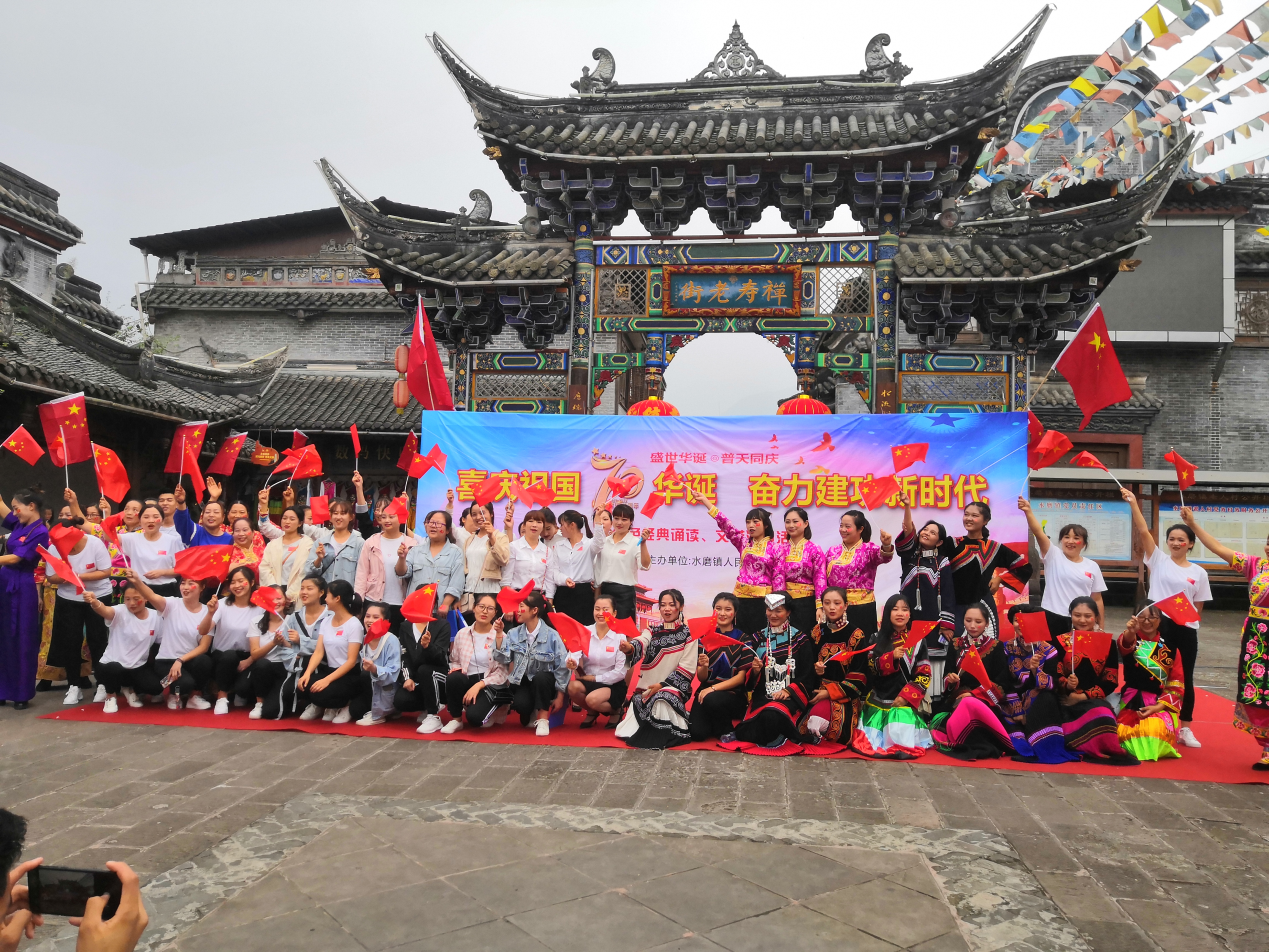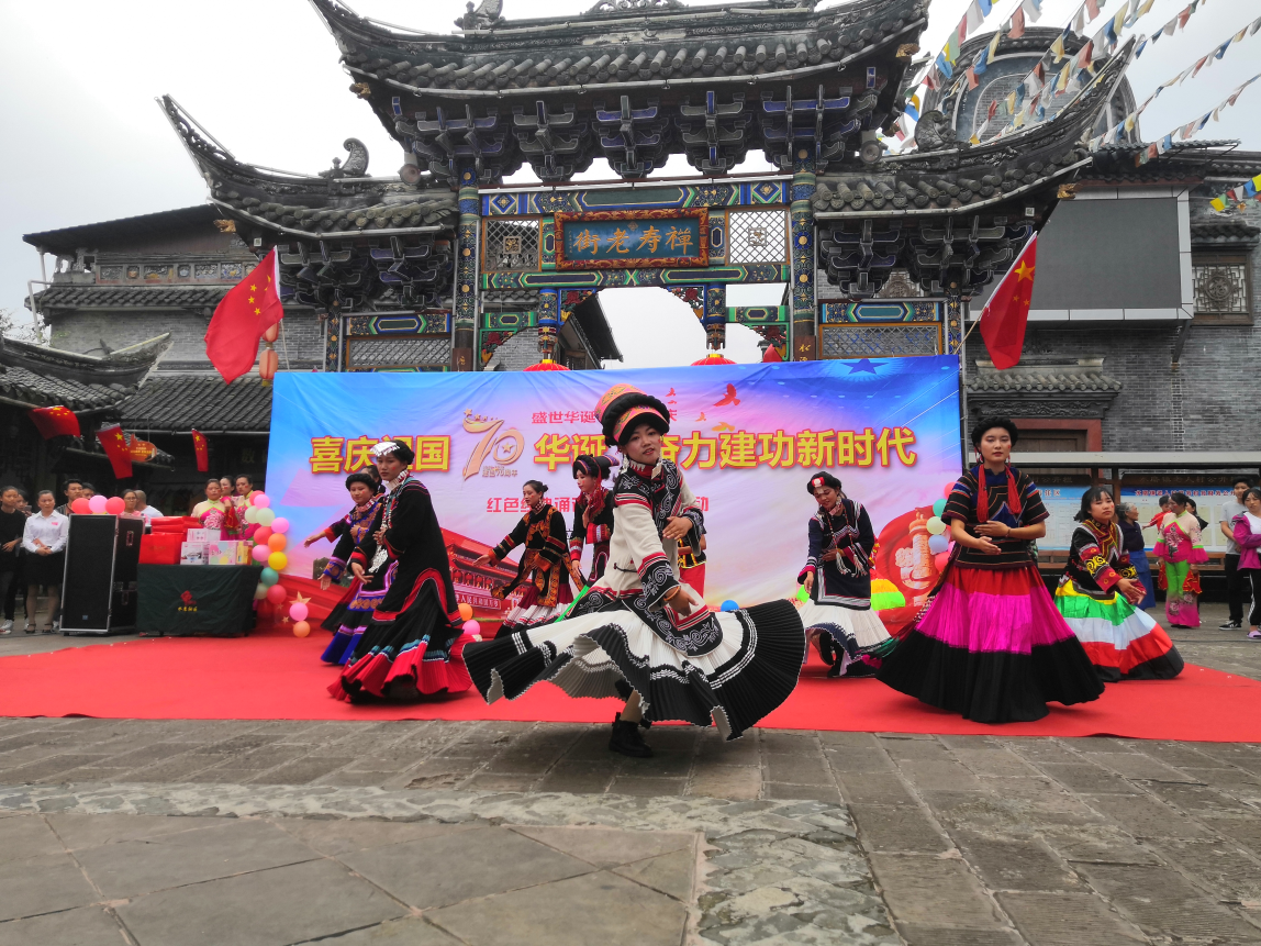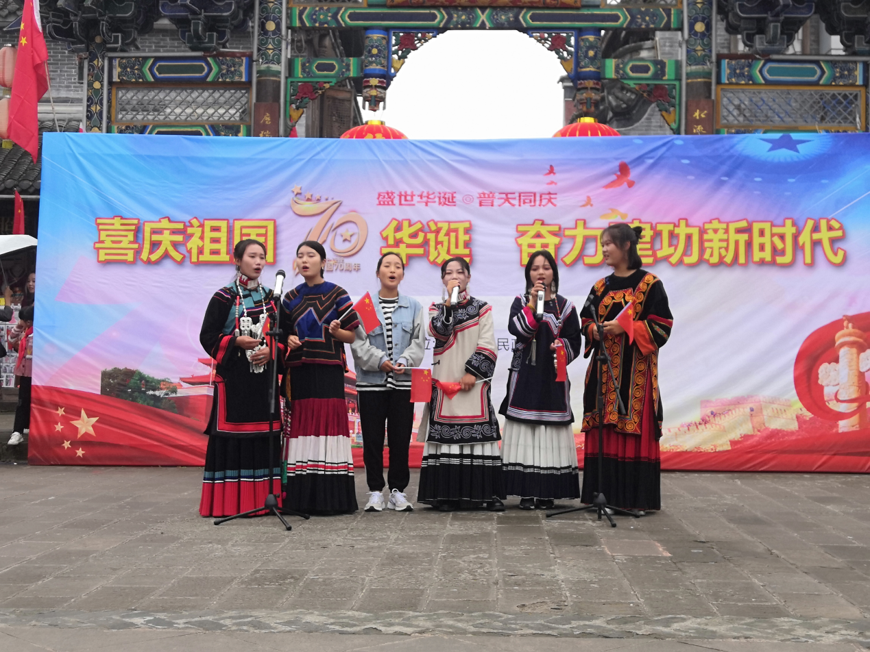 在中华人民共和国成立70周年之际,举国欢庆,在水磨镇政府的组织下,与各村村民带来一场视觉盛宴。美术学院党总支部与结对共村支部—建茅坪子村组队,带去了优秀的彝族民族舞蹈《月琴舞》和合唱《祖国之子》,歌唱社会主义道路好,为人民带来美好幸福生活,感激中国共产党的恩情。通过同学们前期的努力排练,现场取得良好效果,引人欢呼,掌声一片。