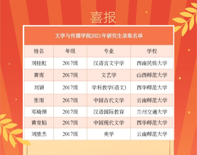 【本网讯】四年朝朝暮暮,一朝金榜题名。新学年,文学与传媒学院共有7名同学进入新的校园,开始他们的研究生学习生涯。据统计,按照今年国家线划分,我院共有7名同学上线,分别被西华师范大学、云南师范大学等高校录取。