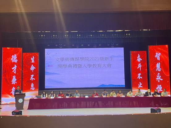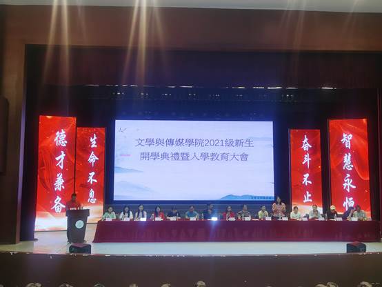 晚7:00大会准时开始。大会分为两个阶段,开学典礼阶段和新生入学教育阶段。开学典礼阶段伊始,全体起立,凑唱国歌。随后我院党总支副书记张晓英老师,我院副院长谭文旗教授,新老学生代表分别致辞发言。接着在新生入学教育中,副院长谭文旗教授给全体新同学作汉语言文学专业人才培养方案解读,我院陈晨老师给全体新同学作网络与新媒体专业人才培养方案解读。最后大会在同学们的热烈掌声中落下帷幕。