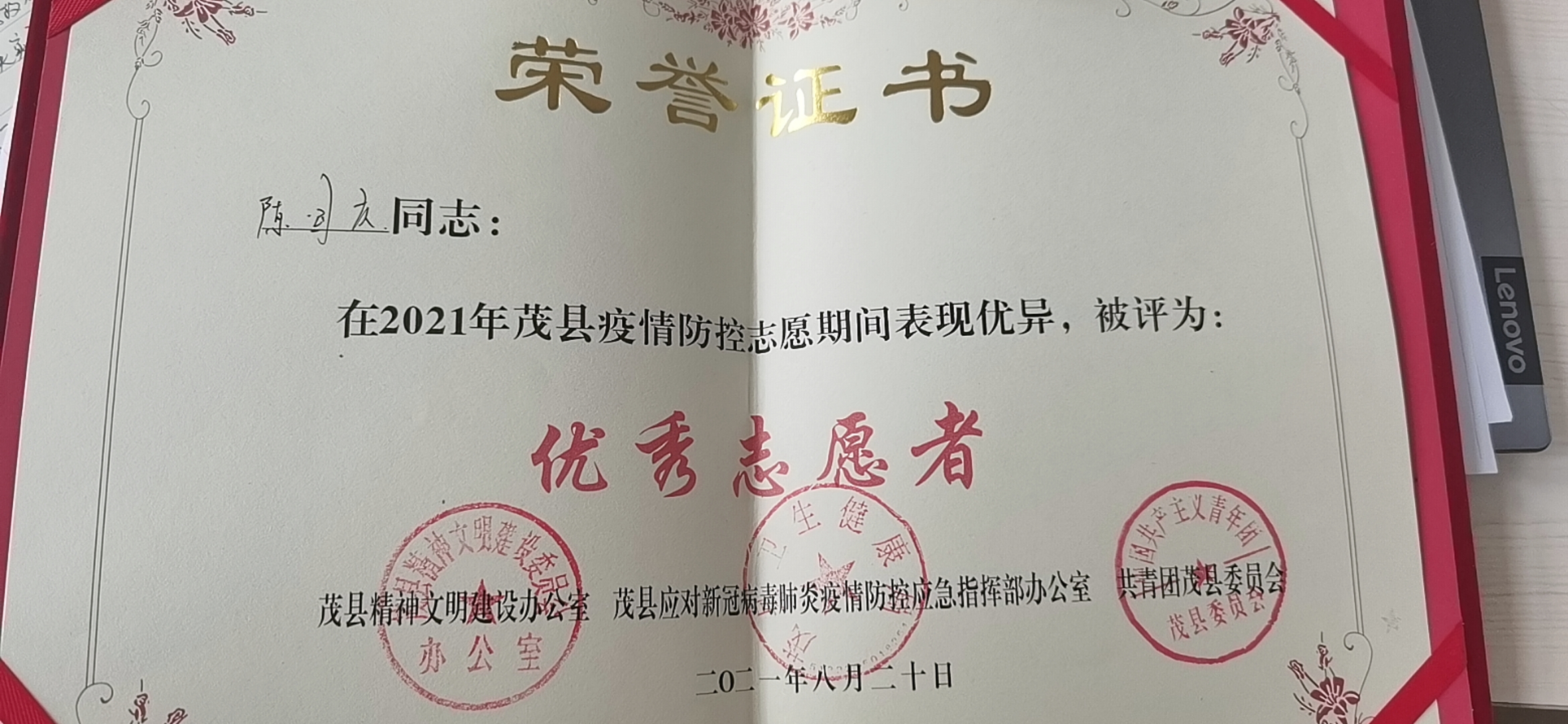 据悉,陈国庆同学在2021年8月暑假期间,积极响应居住地团县委的号召,主动报名参加志愿者。在志愿服务期间,他不怕苦不怕累,主动担当有作为,积极宣传志愿精神,主动参加团组织活动。2021年8月3日,在朋友的介绍下,陈国庆同学主动请缨加入疫情防控工作,配合相关部门开展体温监测、登记排查、数据统计、卡口值班、防疫知识宣传、核酸检测、文明行为倡导、秩序维护等志愿服务,用热心和汗水铸就了隔绝病毒的“安全墙”。