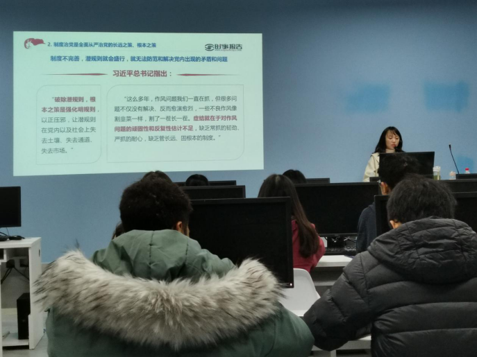 马克思主义学院第一党支部纪检委员栾雁雁老师本次宣讲的主题是“制度治党:全面从严治党的重要保障”。第一部分从“制度治党事关长远”展开,讲诉从2012年至今,在以习近平同志为核心的党中央领导率领下,我国党风焕然一新,党心民心为之一振。但是目前形势仍然严峻,入党积极分子应积极响应习近平总书记号召,认真学习党章,严格遵守党章。