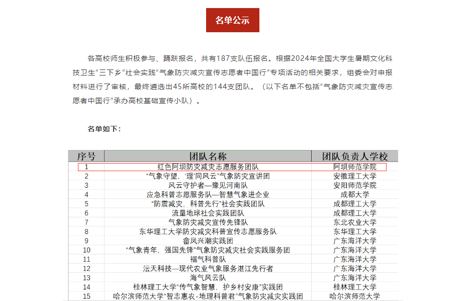 【本网讯】近日,由中国气象局、教育部、共青团中央、中国科学技术协会主办,成都信息工程大学、中国气象学会、全国气象科教融合创新联盟、中国气象局宣传与科普中心(中国气象报社)承办的第十六届“气象防灾减灾宣传志愿者中国行”大型科普活动将于2024年暑假期间开展。各高校师生积极参与、踊跃报名,共有187支队伍报名,经组委会对申报材料认真审核,最终遴选出45所高校的144支团队,我校物理与电子电气工程学院红色阿坝防灾减灾志愿服务团队成功入选,并计划于7月11日至17日赴黑水县开展志愿服务活动。
