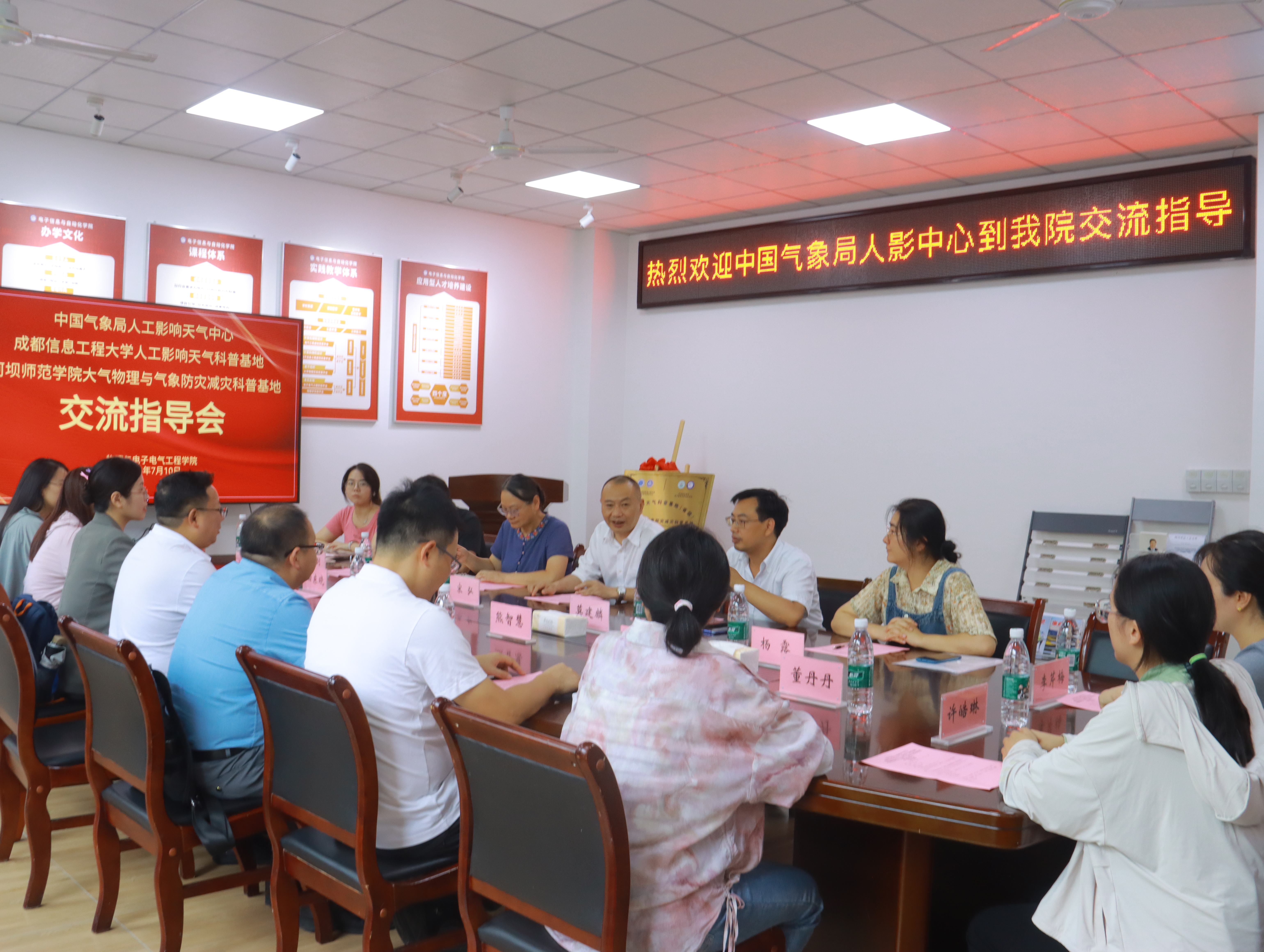 7月10日,中国气象局人工影响天气中心、成都信息工程大学人工影响天气科普基地、我校大气物理与气象防灾减灾科普基地交流指导会在物理与电子电气工程学院会议室顺利召开,成都信息工程大学光电工程学院教授曾体贤;中国气象局人工影响天气中心高工田东晓;成都师范学院创新创业学院副院长熊智慧;我校党委常委、副校长、工会主席宋弘,物理与电子电气工程学院党委副书记卢永雪、副院长莫建麟,物理与电子电气工程学院副院长、红色阿坝防灾减灾志愿服务团队指导教师唐剑出席大会,会议由卢永雪主持。