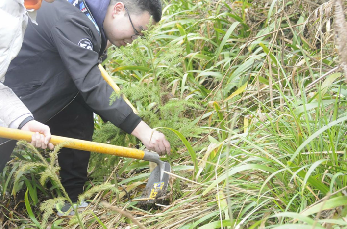 校内植树点上,校团委学生干部和志愿者们将青年林未植完的树苗移送至校内。团委曾兴华老师为同学们讲解挖坑植树的正确方式后,全体植树志愿者们热火朝天地投入到劳动中,大家分工合作,挥锹铲土、扶正苗木、踩实新土、提桶浇水,认真完成每个步骤,合力将一棵棵树苗植入树坑。