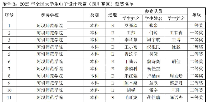 【本网讯】近日,由四川省教育厅主办、全国大学生电子设计竞赛四川赛区组委会、电子科技大学承办的2025年全国大学生电子设计竞赛(四川赛区)落下帷幕。全省共有52所高校的1133支队伍参赛,经过激烈角逐,我校物理与电子电气工程学院11支参赛队获奖,其中一等奖2项,二等奖6项,三等奖3项。其中,两组一等奖获得者将继续参加8月10日由全国专家组统一命题的综合测评。