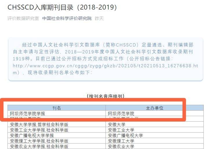 【本网讯】2021年9月1日,《阿坝师范学院学报》成功入选中国社会科学院中国社会科学评价研究院的中国人文社会科学引文数据库(简称CHSSCD)。经中国人文社会科学引文数据库(CHSSCD)定量遴选、期刊编辑部自主申请与定性评估,2018—2019年度中国人文社会科学引文数据库共收录期刊1919种。