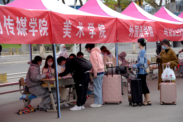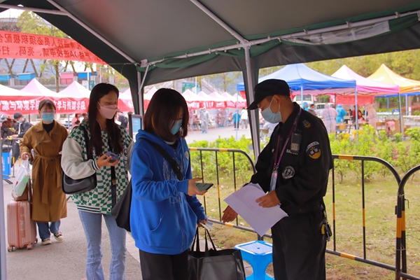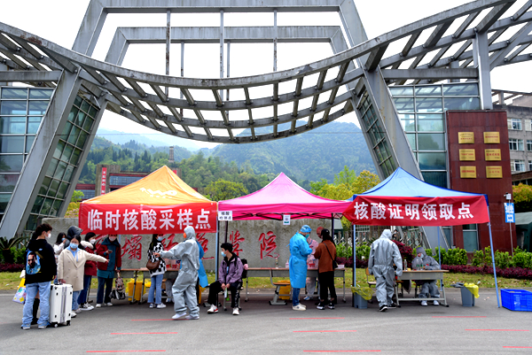 会议结束后,后勤基建处在校门口为各二级学院布置返校点位,汶川县中医院医护人员、辅导员和学生干部三支队伍分别负责核酸采样、查验健康码、行程卡、核酸证明,做好轨迹登记,返校工作井然有序进行。